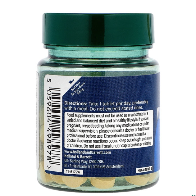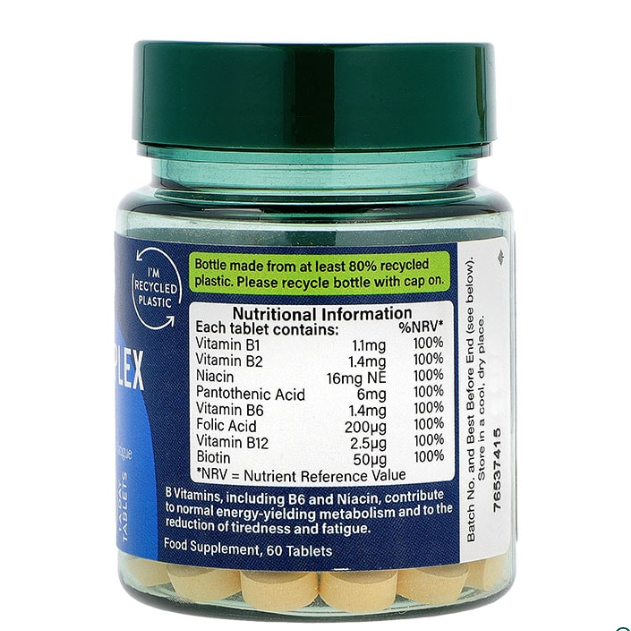 Holland & Barrett Complete Vitamin B Complex contains a combination of eight different B Vitamins: thiamine (B1), riboflavin (B2), niacin (B3), pantothenic acid (B5), pyridoxine (B6), biotin (B7), folic acid (B9) and cobalamin (B12). All of these are considered to be essential vitamins, playing different roles in the human body.